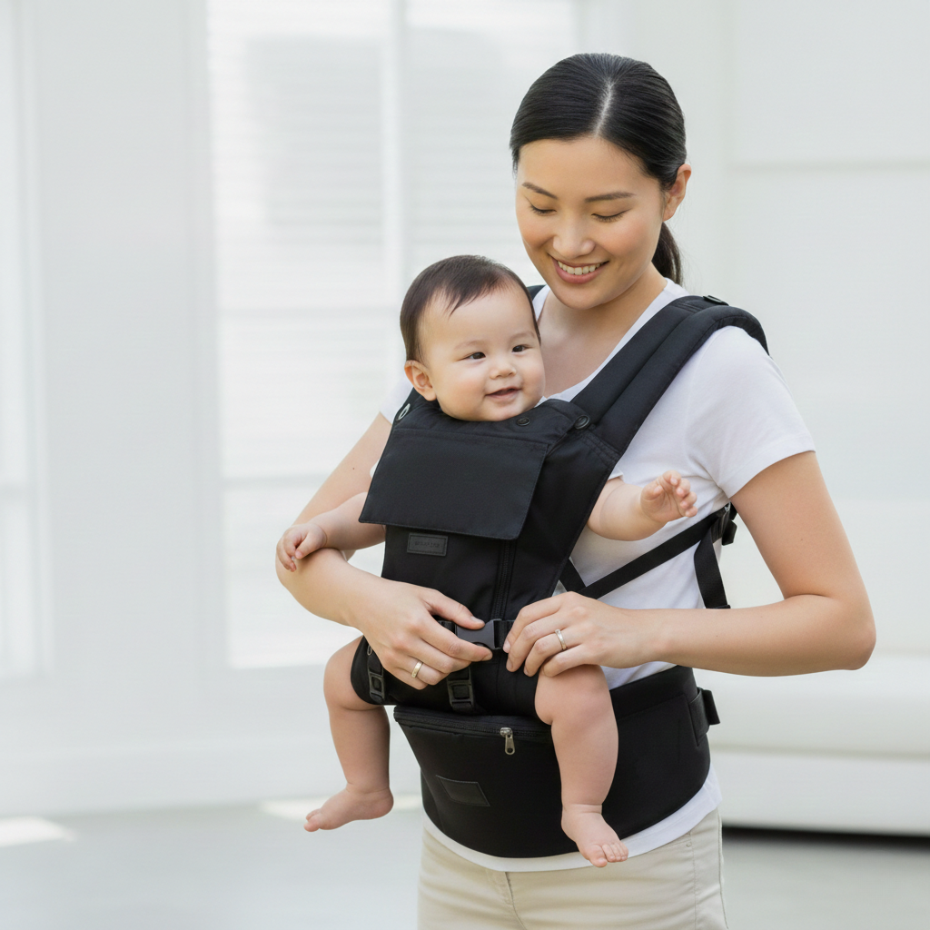 The carrier includes multiple carrying positions and adjustable settings designed to accommodate different stages of use.